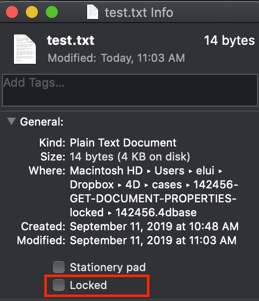 When using the command GET DOCUMENT PROPERTIES, the locked parameter returns a boolean value regarding whether the file is in read-only mode. One clarification is that MacOS calls this attribute as "locked" while Windows calls it "read-only" as shown below.