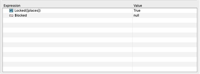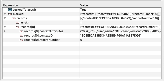 $locked:=Locked Records in Table Method - Running the second method should open up the debugger. Display the variable retuned by the Get locked records info command ($locked) in the expression pane to view details regarding locked records. The object should no longer be null, as shown in the image below.