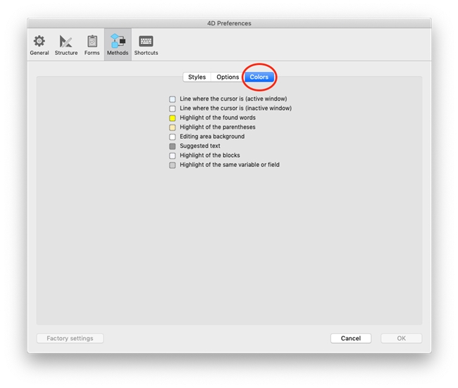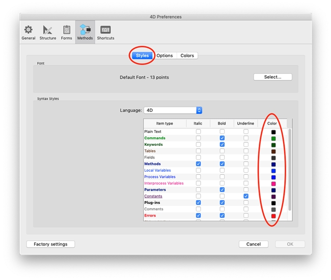 To reset the color scheme back to the 4D default, click on the "Factory settings" button on the bottom left of the dialog window.