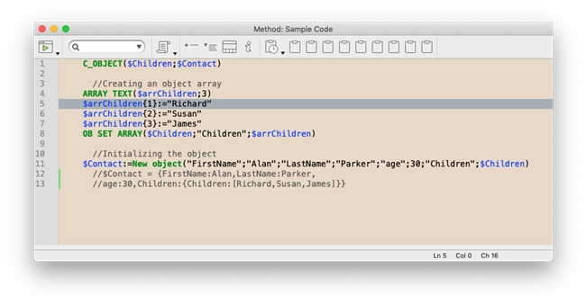 There is an option to customize the color scheme in the method editor. This allows you to create different themes to suit your liking. The color of the background and the code elements (i.e. Commands, Variables, Comments, etc.) can be adjusted in the 4D preferences dialog. A good reason to customize the method editor can be for either personal preferences or more functional purposes. For example, the creation of different themes like dark mode and warm mode can be acheived. Certain color schemes can be chosen to avoid confusion or reduce eye strain. Here is an example of a customized method editor: