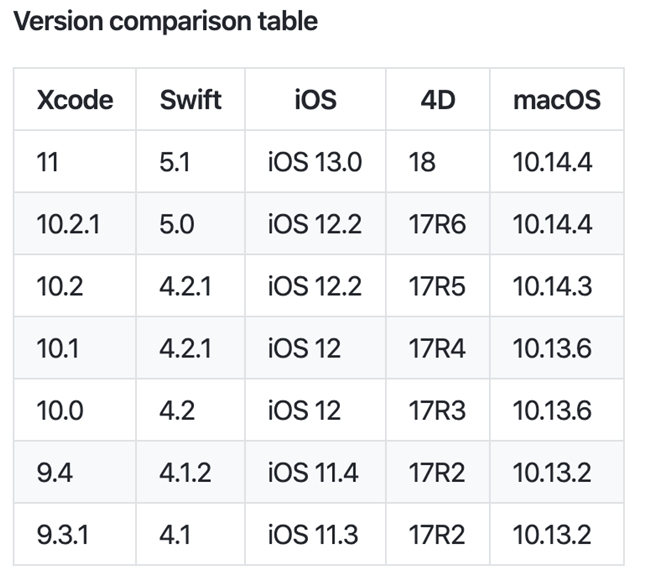 With Xcode, Swift, and MacOS being updated on a consistent basis, always make sure to follow the compatibility chart below to ensure that your 4D for iOS project can be successfully built. Since Catalina 10.15 was only released recently, the compatbility table will also be updated in due time to include this new OS.
