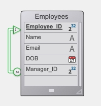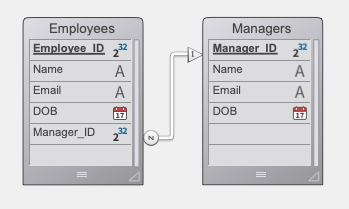 Alternatively, since managers are also just employees, the Employees table can be used for both, and a recursive relation can made linking the Manager_ID with the Employee_ID in the same table. Remember that, in this instance, since Manager_ID is the foreign key to the Employee_ID primary key, the relation should be drawn from the Manager_ID to Employee_ID (N to 1).