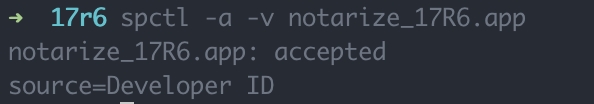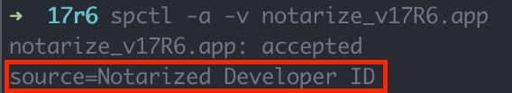 If the signature is valid, the first line should show the output "accepted" next to the app name. The second line shows type of certificate (E.G. Developer ID) that will be prefixed with "Notarized" if the app was successfully notarized.