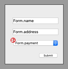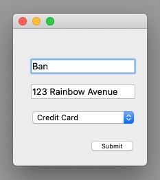 Suppose you have a customer billing information form and you want to capture the customer's information after they have filled out the form and closed the window. The images below show the form having fields for customers to input their name, home address, and payment method. The customer input is saved inside the form data object as form.name, form.address, and form.payment respectively.