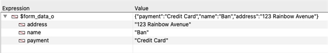 Upon closing the form window, the debug window shows that the same information that was entered on the form has been maintained outside of the form in $form_data_o. All of the data that was previously stored inside the form data object is now stored in the $form_data_o object.