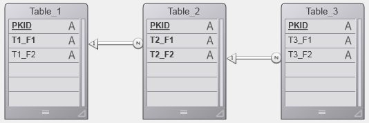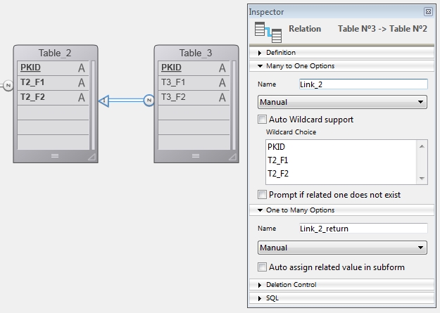 CAUTION: There is actually a query performed on the one table when you enter a value for T2_F1. Unfortunately it is querying for the one record which has the PKID value entered in T2_F1 even though the link is drawn to the T1_F1 field in the one table.