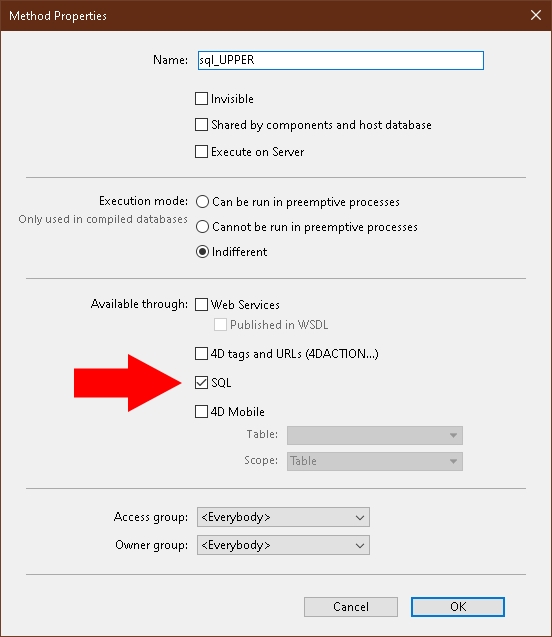 * Note 2: the sql_UPPER method must be set to be available via the method properties: