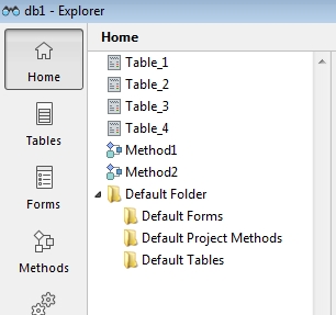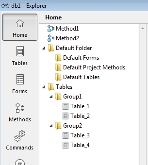 The database structure can be organized in folders which can be viewed in the Explorer window's Home section. By default all tables are created in the root level which is called the "Top Level".