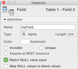 This option validates records at the database engine level, as opposed to the "Mandatory" option which is used for data entry control (i.e. when a user inputs data). When the "Reject NULL value input" option is turned on for a field, 4D will treat the field as a mandatory field when saving records to the table, thus returning the above error when attempting to save a record with Null value in that field.
