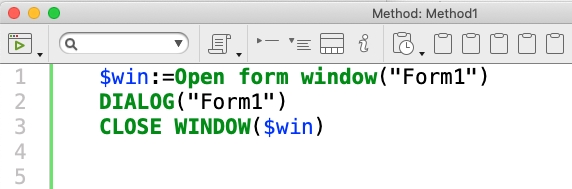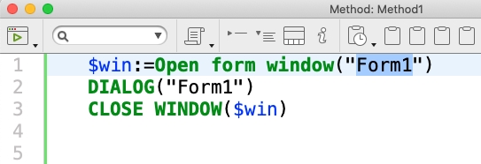 Form editors can be directly opened from the method editor when working on code in design mode. If there are references to a project/table form name in your method editor, you can have it instantly appear. This is done by highlighting the form name and pressing ctrl + L (Win) or cmd + L (Mac). Doing this will directly open the highilighted form editor.