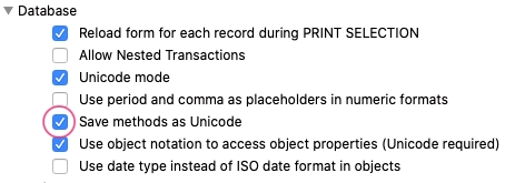 In 4D v15 and later, methods are automatically saved in Unicode. For databases created before v15, this option will need to be turned on manually.