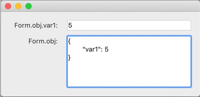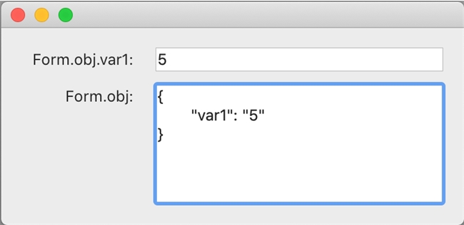When adding new attributes to an object on a form, note that variables will default the data as a string value. Take the example below where the user enters the number "5" into the form variable Form.obj.var1. The data stored in Form.obj.var1 is a string value of "5" rather than the numeric value 5.