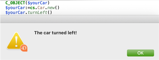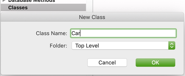 4D v18 R3 introduces a new Classes feature that allows us to create methods (called functions) that are shared between object instances of the same class. This is great for writing more modular, cleaner code. For example, let's create a new "Car" class: