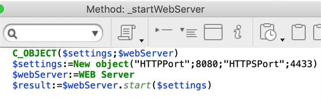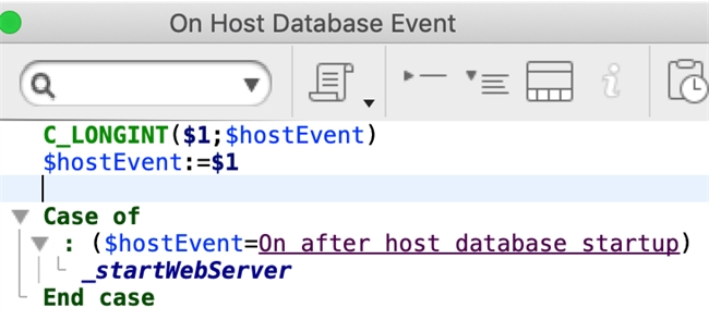 We create and pass a $settings object into $webServer.start() to configure the HTTP and HTTPS ports, so as to not use the same ports as our host database's web server when we start the component web server. Then, we put our method in the On Host Database Event method: