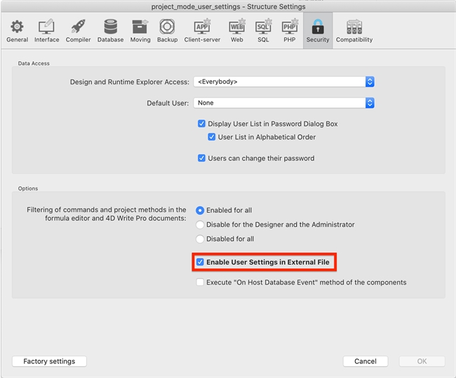 Once the setting has been enabled and the database is compiled, the structure settings will no longer be grayed out in the .4DZ file.