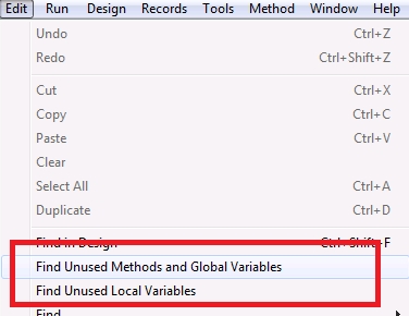 Find Unused Methods and Global Variables will return a list of methods and global variables that have been created but not referenced anywhere within the scope of the database structure. This includes cases where the method is writted as a string such as when passed as the first parameter of the New process command, however methods listed in a comment will not affect this. After cleaning up the methods, the feature should be ran again as the feature is not as advanced to display methods that are only used within the scope of an unused method stack.