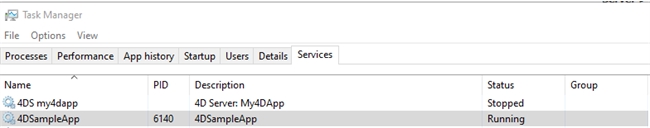 E.G. sc.exe create 4DSampleApp binpath="C:\Program Files\4D\4D v18.2_252363\4D Server\4D Server.exe -s C:\Users\Erick\Desktop\Test\My4DApp.4dbase\My4DApp.4DB"