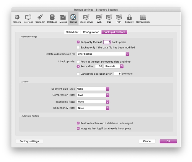 The "Automatic Restore" options within the Backup and Restore database settings are enabled by default, and it is recommended to leave this option enabled. The option should remain enabled throughout database upgrades, but if you havent checked in a while, it may be a good idea to double-check and verify that it is still enabled. This is because restoring from backup and integrating the journal file is the abbsolute best way of recovering from any type of data intgretity issue.