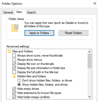 - Click on the "View" tab and under Advanced settings, select "Show hidden files, folder, and drives"
