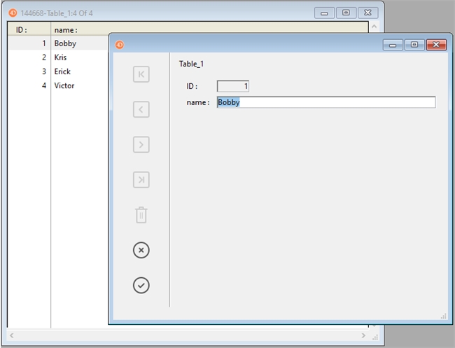 | Case of : (Form event code=On Double Clicked) C_LONGINT($win_l) $win_l:=Open form window([Table_1];"Input") DIALOG([Table_1];"Input") CLOSE WINDOW($win_l) FILTER EVENT End case |