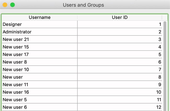 Below is a comparison of the user and user IDs of the same database, binary (left) vs. project (right) mode. New users were created sequentially by Designer. User IDs were obtained using GET USER LIST.
