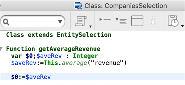 In particular, you want to get the average revenue of an entity selection of Companies. To accomplish this, you can create an entity selection class function like below: