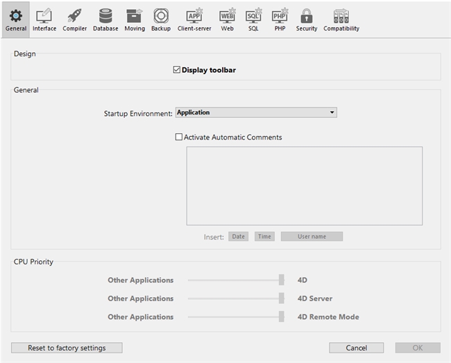 As shown in the image above, the setting is found at the bottom. However these settings are deprecated and no longer useful as 4D has been optimized over the years since this setting was relevant. Newer databases or databases with these settings set to default will not have a CPU Priority section.
