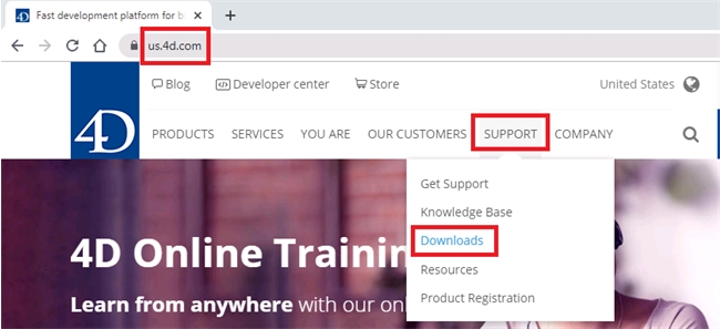 Starting from us.4d.com navigate to Support and select Downloads from the drop down list to get to the download page.