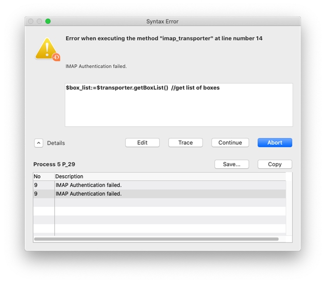 If the POP3 or IMAP mail servers are not supported or enabled, the connection from 4D will fail. When using the new transporter commands, the runtime error "{IMAP/POP} Authentication failure" appears. When using the internet commands, an error code will be returned from IMAP_Login or POP3_Login.