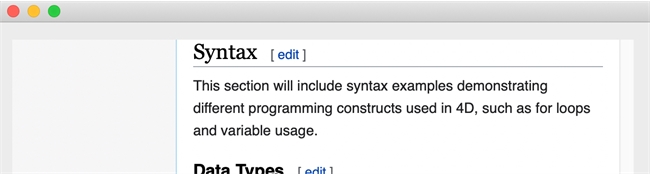 For example, say that you want to automatically load the "Syntax" section of 4D's Wikipedia page. Quick inspection of the page's HTML source shows that the section has the id name "Syntax". Then, you can insert code like the following in the On Load event case of your web area: