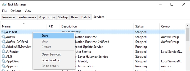 When registering a database as a service, the service will still have to be manually started up under Task Manager > Services shown in the image below:
