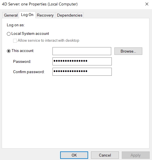Now when the service is started it will be under the selected account. If the current user logged on to the machine running the 4D client is the same user, the client can perform changes to the code.