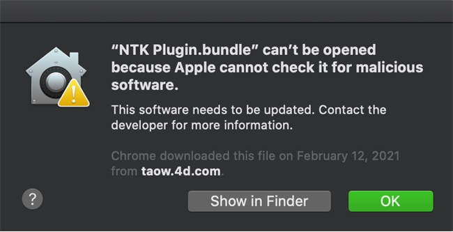 It most likely means that the plugin is old and needs to be updated (and notarized). If you trust the source of the application and would like to override this check, go to System Preferences… > Security & Privacy for your Mac.