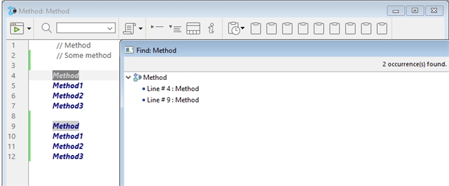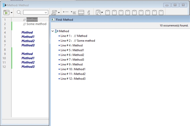 Search reference on a comment will find every single text that includes the highlighted item. For example, when searching for "Method", it will find all comments and methods that contain the text "Method" as shown below: