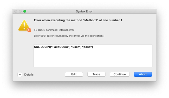 Ecountering the error "Error 9921 (Error returned by the driver via the connection)" on a call to SQL LOGIN may signify a problem with the ODBC driver passed in the command's first parameter. Choosing the correct ODBC driver and bitness is important to setup an ODBC connection. When determining the correct ODBC Driver to be used, it should be host database's ODBC driver and the bitness of the driver should match the client application making the ODBC connection.