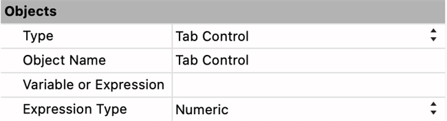 By linking the tab control to a choice list, the reference number of the list item can be obtained whenever a user clicks on a tab item. This can be accomplished using the command Selected list items and minimal set up of the tab control. First, make sure the “Variable or Expression” of the tab control is blank. Then, “Expression Type” should be set to Numeric.
