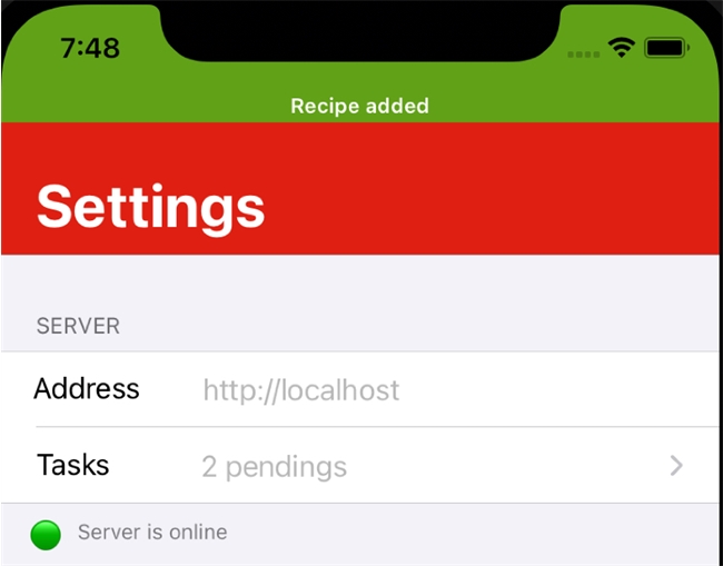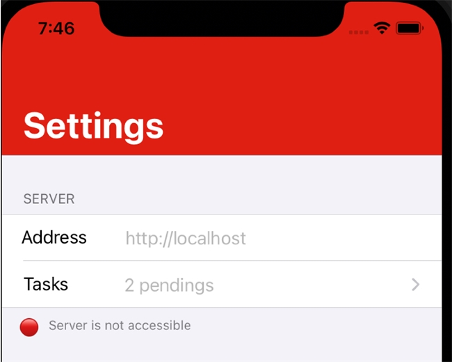 To test this feature in Simulator, first build and run your project. After the application is built on Simulator, stop the web server. Confirm that the app is in offline mode by going to the Settings tab. Under Tasks it should say “Server is not accessible” with a red icon.
