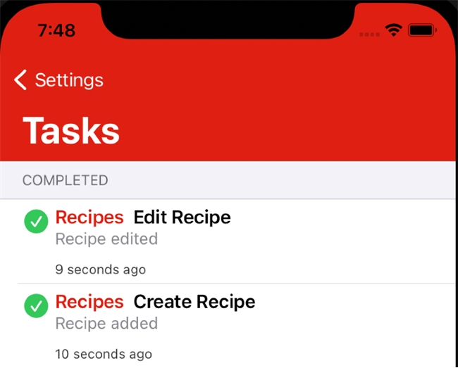 From here, users should be able to do any basic actions on the application and have it queued in Tasks. When a new action is executed by the user, the app will confirm that their action will be executed later, when the app has connection to the server again.