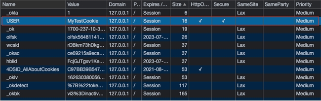 - The inspector should display something like the image below which shows all of the used cookies and their attributes. In the list, we see the 'USER' cookies we sent as well as its attributes