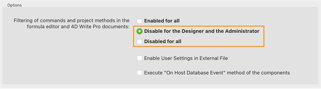 Then, in the Options section, select either “Disable for the Designer and the Administrator” or “Disable for all” for the filtering of commands and project methods setting.