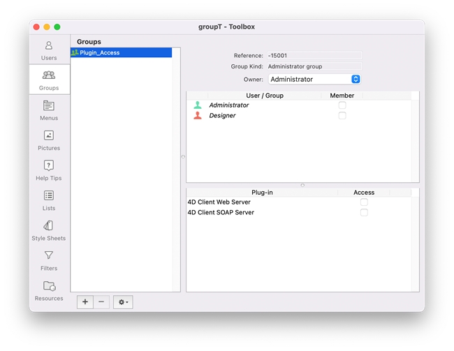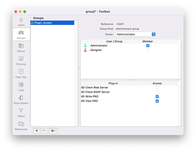 If there is a group with access to certain plugins, Aministrator must be a member of that group in order to view and edit privileges for those plugins in the Toolbox (4D Write Pro & 4D View Pro are now visible to Admin in Toolbox after adding Admin to group with access to those plugins).