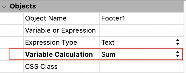 Opening the first column's footer properties, the footer calculation is set to "Sum". This causes an error because the sum calculation is incompatible with the text type data in the column.