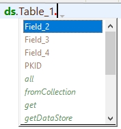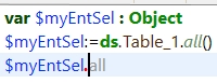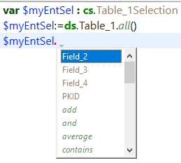 As shown, in the first line, the declaration of $myEntSel as a Table_1Selection class instead of an Object allows the method editor to make suggestions based on the class instead of a generic object. This can help with writting code by allowing the fields of the specified table to be listed. This can also alleviate issues caused by incorrect character cases, as object notation is case-sensitive.