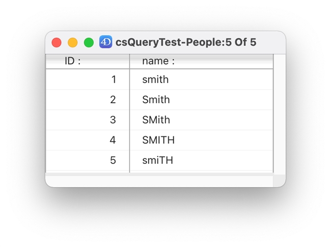By default, string queries usually ignore letter casing. For example, a query for “Smith” could return “Smith”, “smith”, and “SMITH”. To perform a case-sensitive string query, use Match regex in a query formula. For instance, given a “People” table and “name” field with these records: