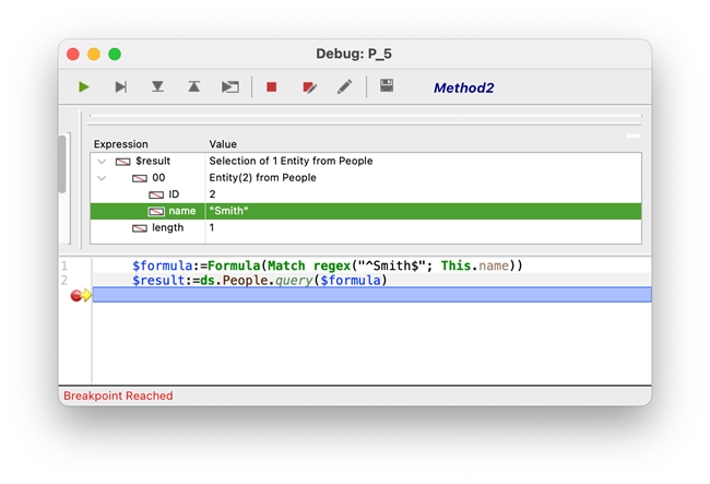 | $formula:=Formula(Match regex("^Smith$"; This.name)) $result:=ds.People.query($formula) |