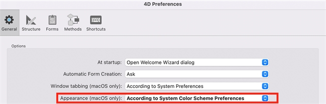 This setting is found under the top menu bar 4D > Preferences in the dropdown setting Appearance (macOS only) and affects 4D's development UI like the Design toolbar, Method editor, etc.