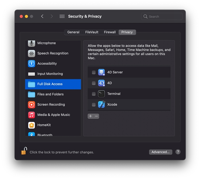 After encrypting data, 4D will offer to save the encryption key in a .4DKeychain file. This file can then be stored on an external device to be used on the next startup of the application. If 4D does not find an encryption key on the external device at startup, check that the .4DKeychain file is stored at the root level of the external device. 4D may also need to be given Full Disk Access (on macOS) to be able to find the encryption key. To enable this feature, go into System Preferences > Security & Privacy > Privacy and look for "Full Disk Access".