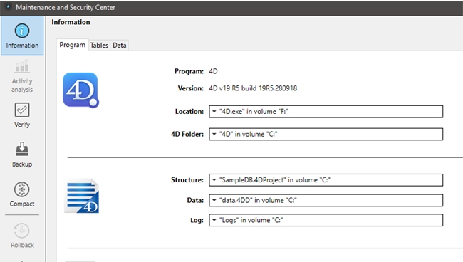 When using 4D, especially deployed at a site or working with multiple versions and copies of 4D and databases, it can be helpful to have a sanity check of which database files are being used and where they are located.