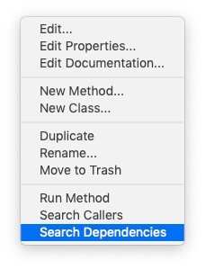 From the Home or Methods page of Explorer, right-click on a project method to display a pop-up menu. Select Search Dependencies to list all dependencies (project and component methods).