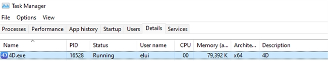 When running 4D in headless mode, it can sometimes be hard to tell if it actually successfully opened in headless mode. To quickly check, open Task Manager > Details tab to see whether a 4D.exe process is running. If this process does not show up in Task Manager > Processes tab or the Services tab, but shows up in the Task Manager > Details tab, then 4D has successfully run in headless mode.